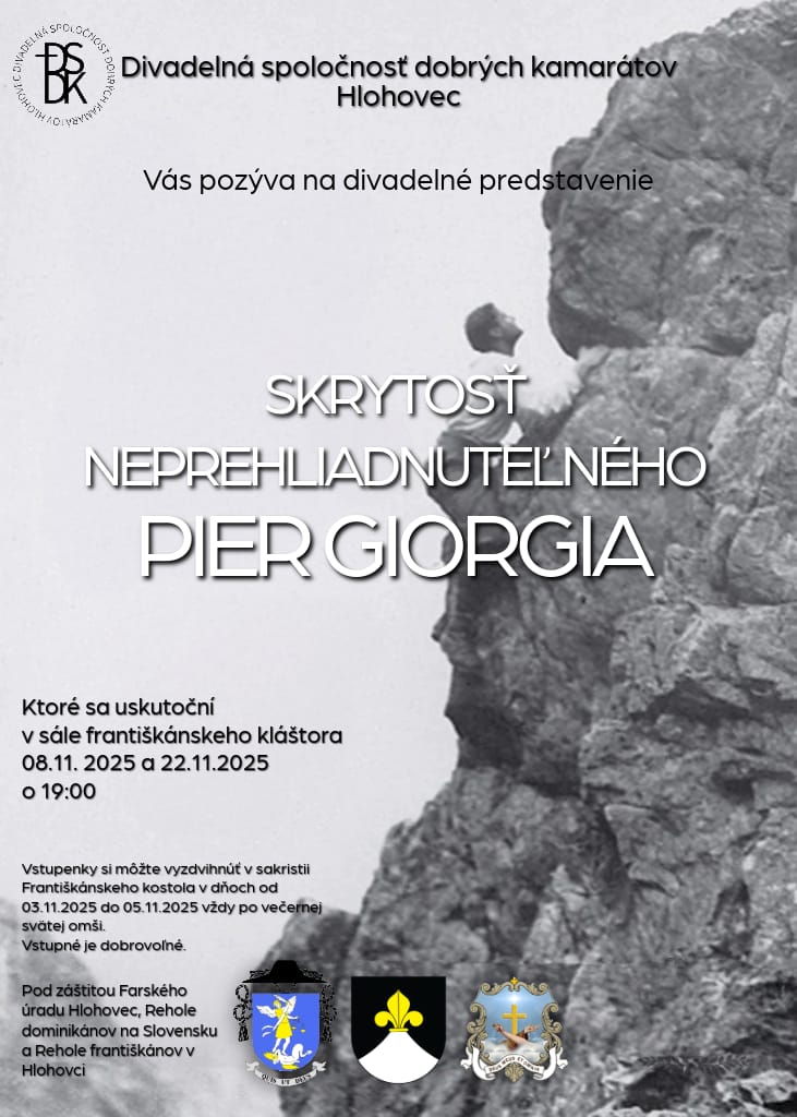 DSDK - Divadelná spoločnosť dobrých kamarátov vás pozýva na divadelné stvárnenie hry zo života svätého Pier Giorgia Frassatiho, v sobotu 8.11.2025 a v sobotu 22.11.2025 o 19.00 hod. v sále františkánskeho kláštora v Hlohovci.